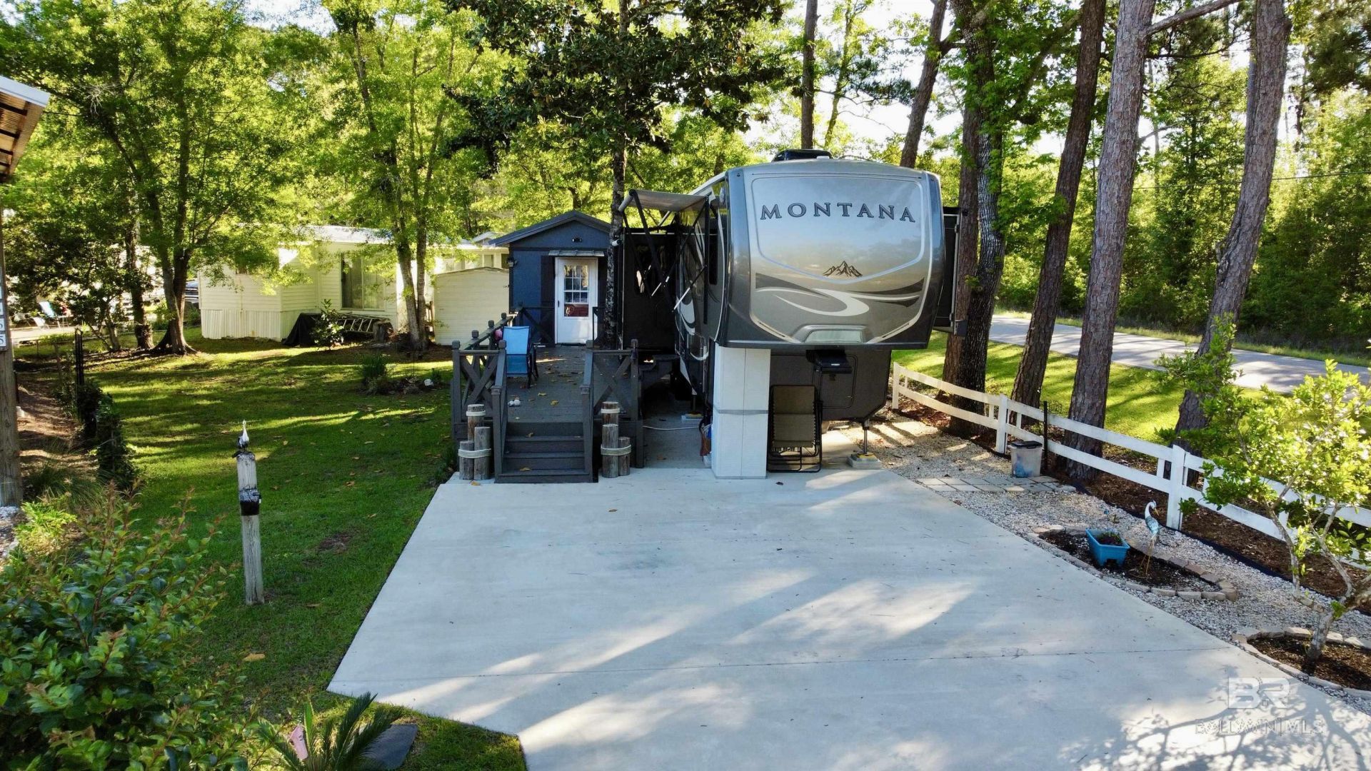 Location, Location, Location! Charming 1-bedroom, 1-bath cabin tucked away on a beautiful wooded lot in a quiet cul-de-sac?one of Gulf Shores' last secluded natural gems. Conveniently located near fishing on the Bon Secour River, a boat launch, and the stunning white-sand beaches of Gulf Shores. Enjoy breathtaking sunsets over the Bon Secour River while surrounded by nature at its finest. Relax on the large deck or screened-in porch and take in the peaceful setting. Major updates and improvements include: All new wiring and remodeled interior (2022)RV electrical box replaced (June 2022)Support beams, most wall studs, and plywood flooring replaced Plumbing replaced and/or repaired Roof repaired (2024)Decking and porch repaired (2025)The property also features a fully equipped RV hookup with electric, water, sewer, and a concrete pad.5TH WHEELDOES NOT CONVEY WITH PURCHASE BUT CAN BE PURCHASED SEPARATELY!!!Buyer to verify all information!!! Buyer to verify all information during due diligence.
